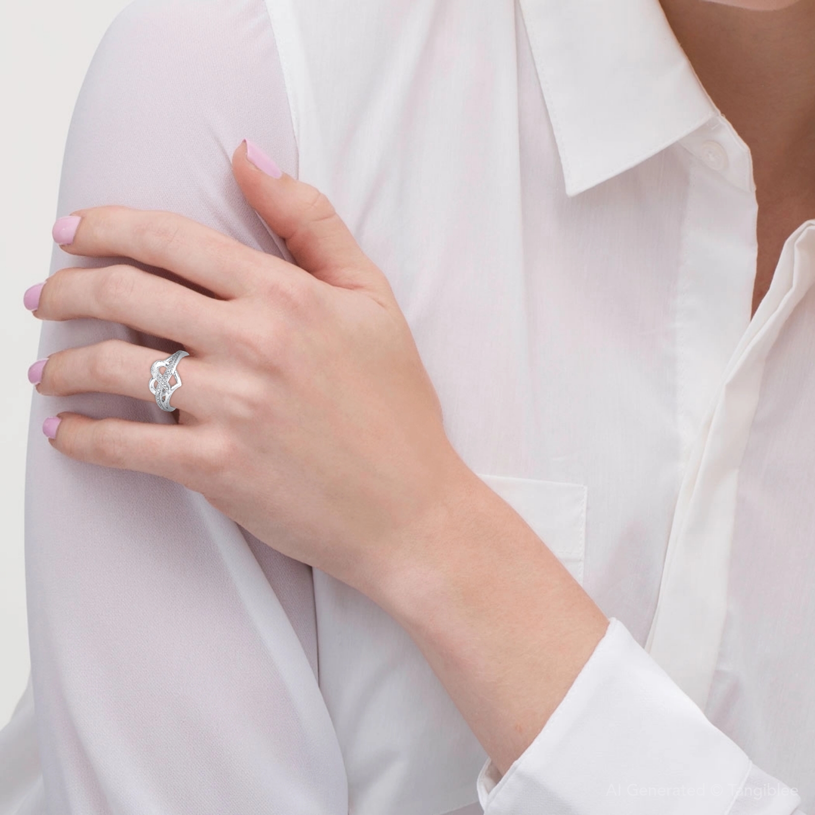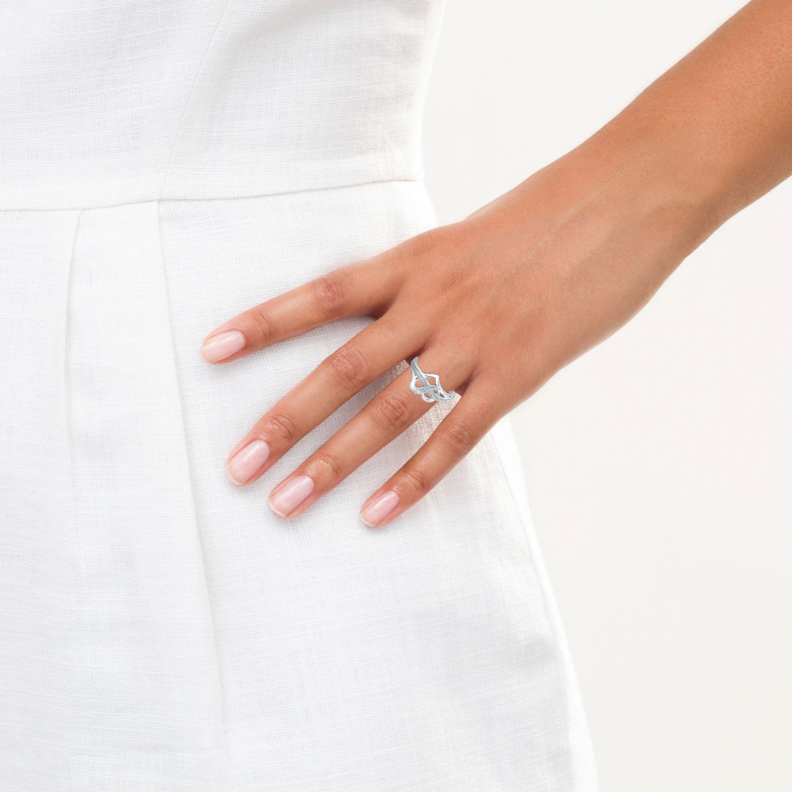 A dazzling band of diamond accents winds through a heart studded with more diamonds in this romantic ring for her. The ring is fashioned in sterling silver.